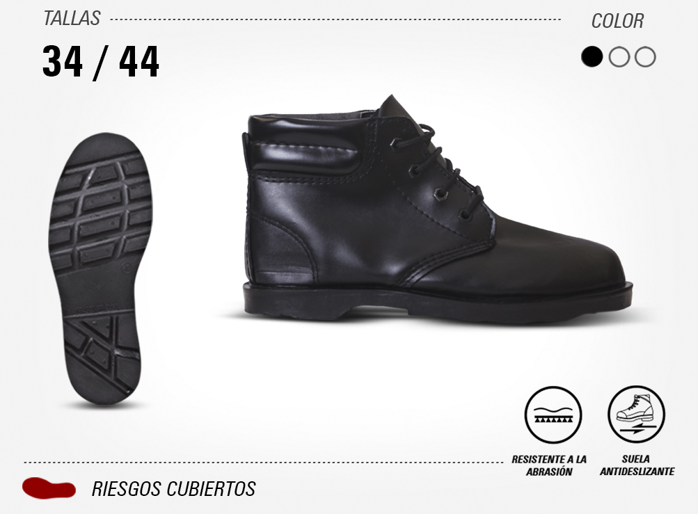 BOTA SENCILLA es un botín sin puntera fabricado en cuero liso negro calibre 18-20, con suela en caucho vulcanizado al corte, botín ideal para nuestros guardas de seguridad en sus caminatas diarias brindando comodidad y durabilidad. También para el personal encargado de oficios varios. |