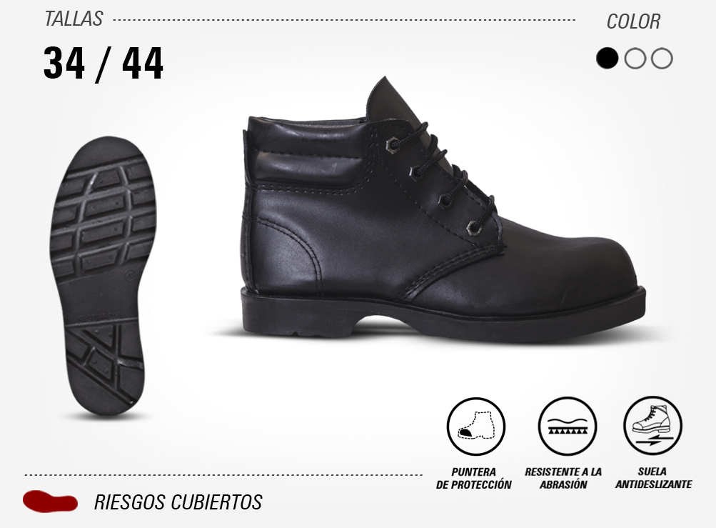 BOTÍN SEGURIDAD es fabricado en cuero liso calibre 18-20, con puntera de acero y suela en caucho vulcanizado al corte. Ideal para trabajo de obras viales y construcción, dando comodidad y resistencia a la abrasión.