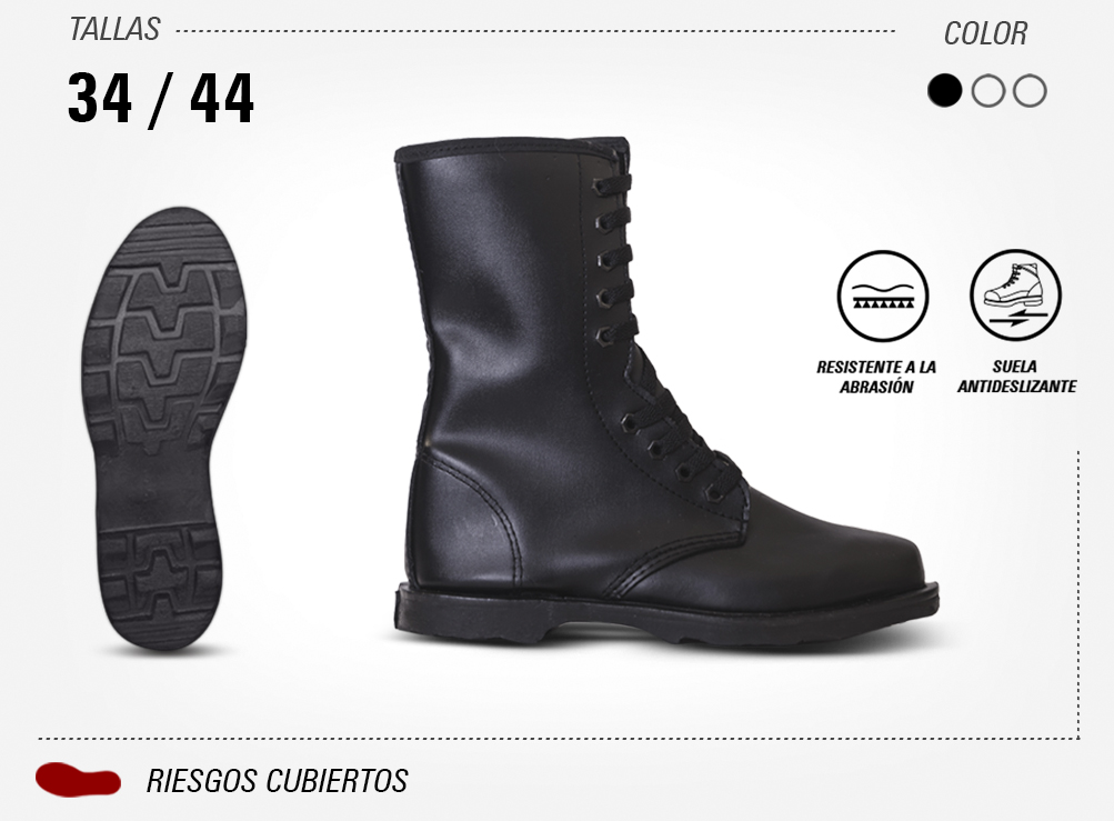 BOTA MILITAR SENCILLA es una bota de caña media sin puntera, fabricada en cuero liso calibre 18-20 y suela en caucho vulcanizado al corte, es ideal para el personal de seguridad.
