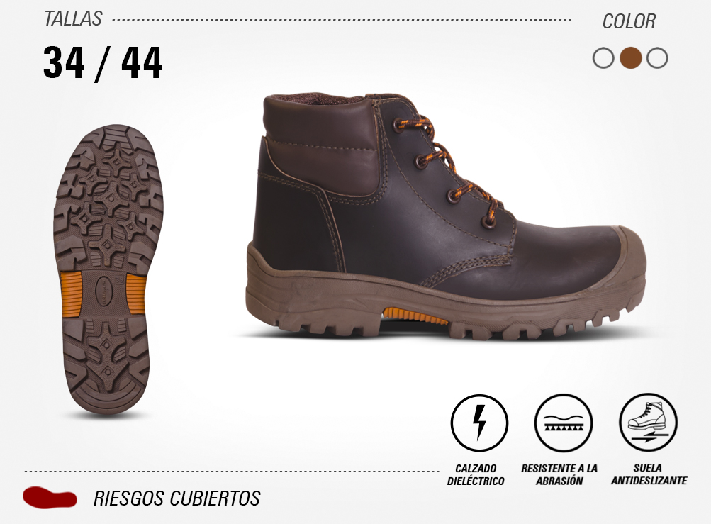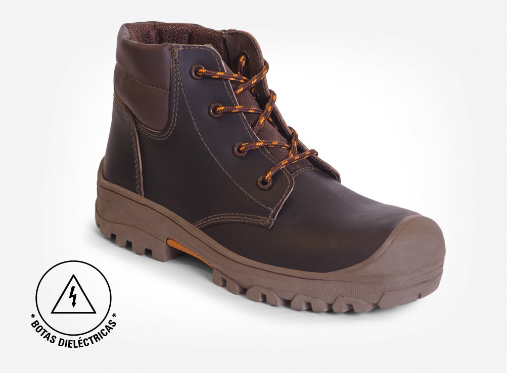BOTA DIELÉCTRICA es un botín de seguridad fabricado con puntera composite y en cuero calibre 18-20, con suela de caucho dieléctrico prefabricada y cementada al corte.