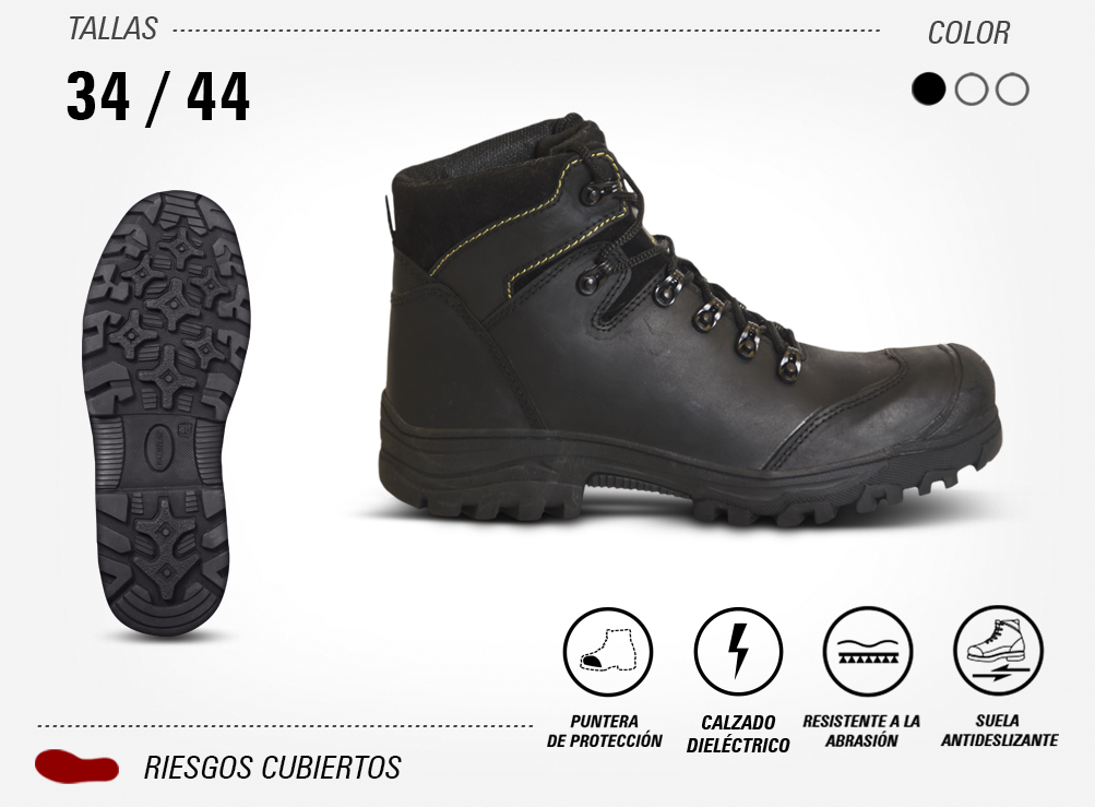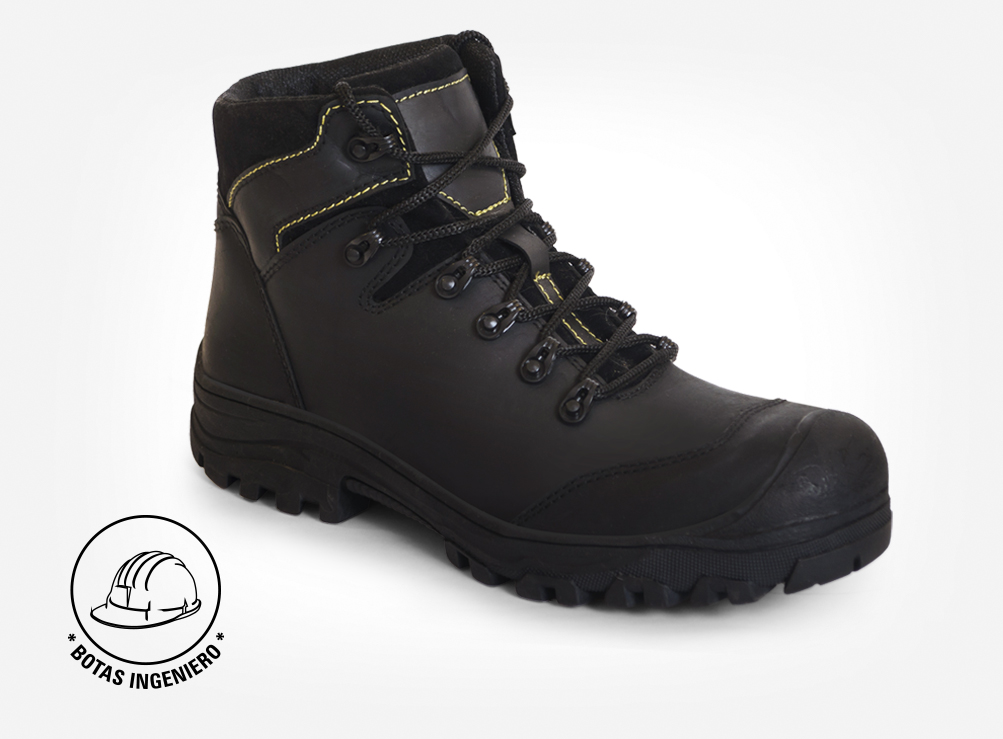 BOTÍN DE SEGURIDAD INGENIERO es un botín fabricado en cuero graso negro con puntera composite y suela de caucho dieléctrico prefabricada y cementada al corte.