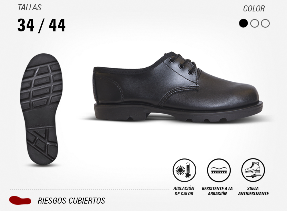 ZAPATO COMANDO es un zapato hecho en cuero liso calibre 18-20 y suela en caucho vulcanizado al corte, ideal para guardas de seguridad que trabajan en centros comerciales y climas calientes.