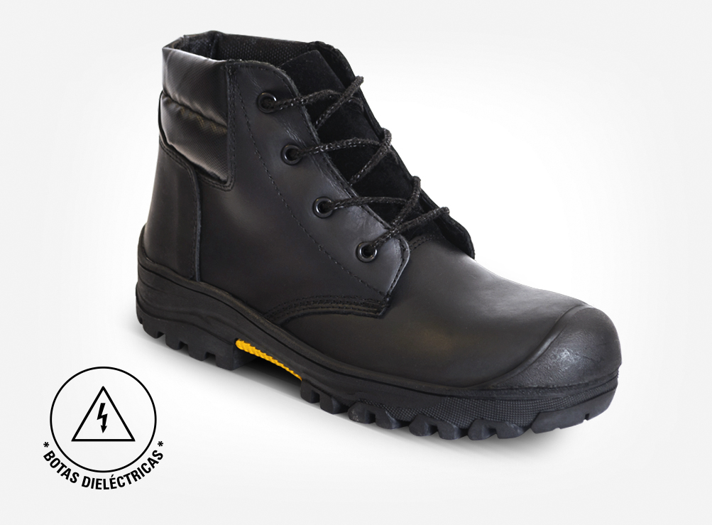 BOTA DIELÉCTRICA es un botín de seguridad fabricado con puntera composite y en cuero calibre 18-20, con suela de caucho dieléctrico prefabricada y cementada al corte.